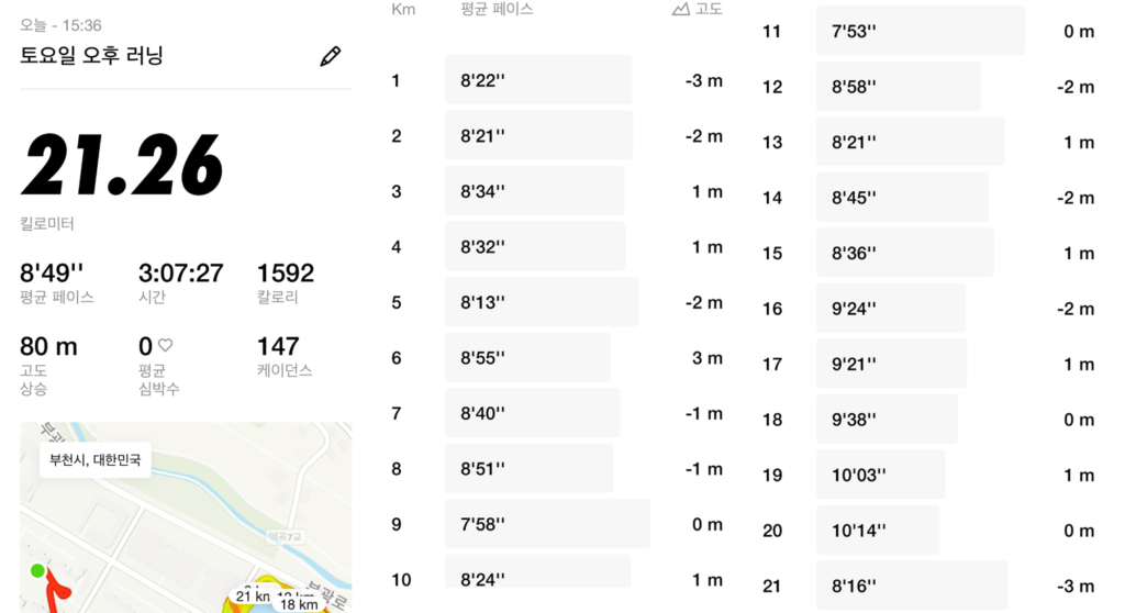 11월 16일에 하프 대회를 신청해 놓았기 때문에, 21K를 한번 달려보았다. 8분 30초 페이스로 가는 것도 힘들었고, 15km부터는 걷는 수준의 속도가 나왔다. 마지막 1km는 8분 페이스로 다시 돌아왔으니, 어쩌면 몸이 지루함을 견디지 못했던 것일지도 늘어진 것일지도 모르겠다.