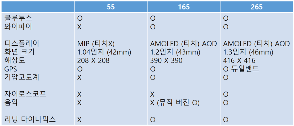 가민 포러너 55를 구매하려고 했으나, MIP 디스플레이라서 시인성에 대한 우려가 있었고,(잘 보인다고 한다) 무엇보다도 고도계가 없어서 패스했다. 그리고 165와 265의 눈에 보이는 차이는 GPS 듀얼밴드와 싱글밴드의 차이였는데, 지금까지도 거의 확신하지만, GPS 차이는 별로 없을 것이다. 그 때문에 보다 저렴한 165로 최종 선택했다.