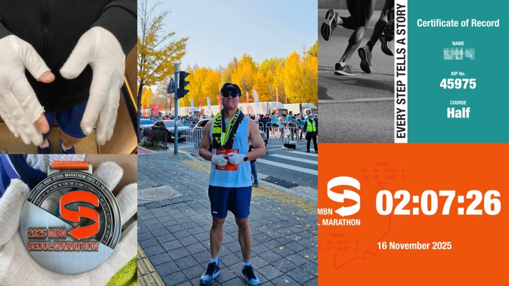 MBN 서울 하프마라톤에 다녀왔다. 목표였던 1시간 59분은 달성하지 못했지만, 5K·10K·하프 PB를 모두 갱신했다. 2시간 7분, 지금 나에게는 만족해야만 하는 기록인 것 같다. 재미있었다.