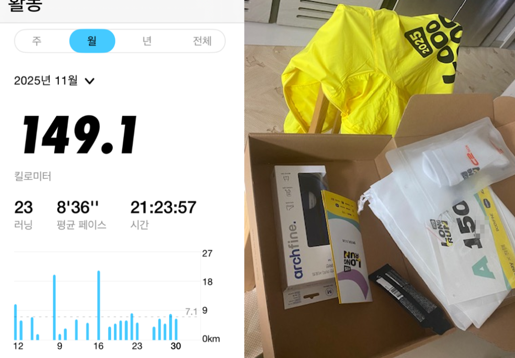 이번 11월은 오히려 마일리지가 줄어들었다. 겨울 동안 서서히 거리(마일리지)를 올려서, 내년에는 꼭 풀코스를 완주할 예정이다. 월간 300km 이상을 목표로 하고 있지만, 생각보다 쉽지 않다.