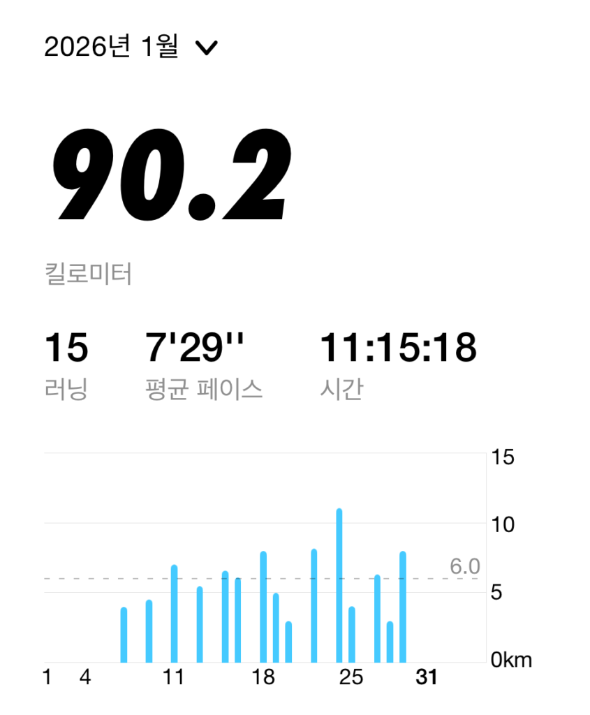 2026년 1월 마일리지는 100km도 되지 않는다. 2025년 12월 31일 혈뇨 이슈 이후 달리는 양을 줄였고, 완전히 회복되지 않으면 달리지 않다 보니 마일리지가 크게 줄었다. 200km는 넘겨야 하는데, 그게 쉽지 않다. 3월 8일에는 고양 하프 마라톤이 있고, 4월 26일에는 충북 음성에서 풀코스 마라톤이 있다. 잘 준비해야 할 텐데, 하면 할수록 쉽지 않다는 것을 느낀다.