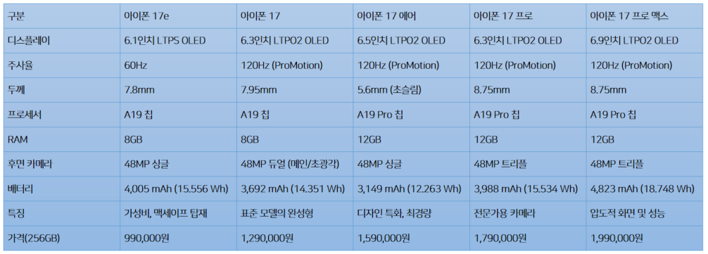 ※ 아이폰 17시리즈는 [아이폰 17e, 17, 에어, 프로, 프로 맥스]로 구성되어 있다.
